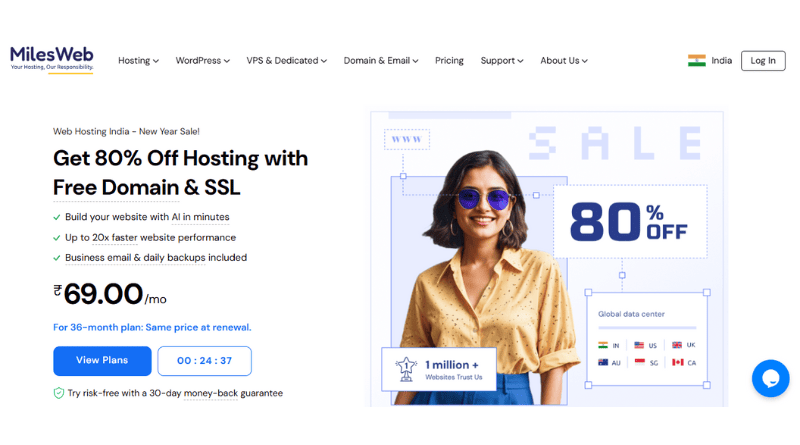 MilesWeb positioned themselves as one of the best hosting providers in India, offering a complete spectrum of web hosting solutions. We offer the complete spectrum of web hosting plans including  shared, VPS, dedicated, cloud, reseller, managed WordPress hosting, and others. Our comprehensive suite of packages meet the hosting demands of bloggers, SMEs, and established corporations. With over 13 years of industry experience and the trust of 80,000+ global clients, we provide high-performance hosting solutions for every stage of business growth.