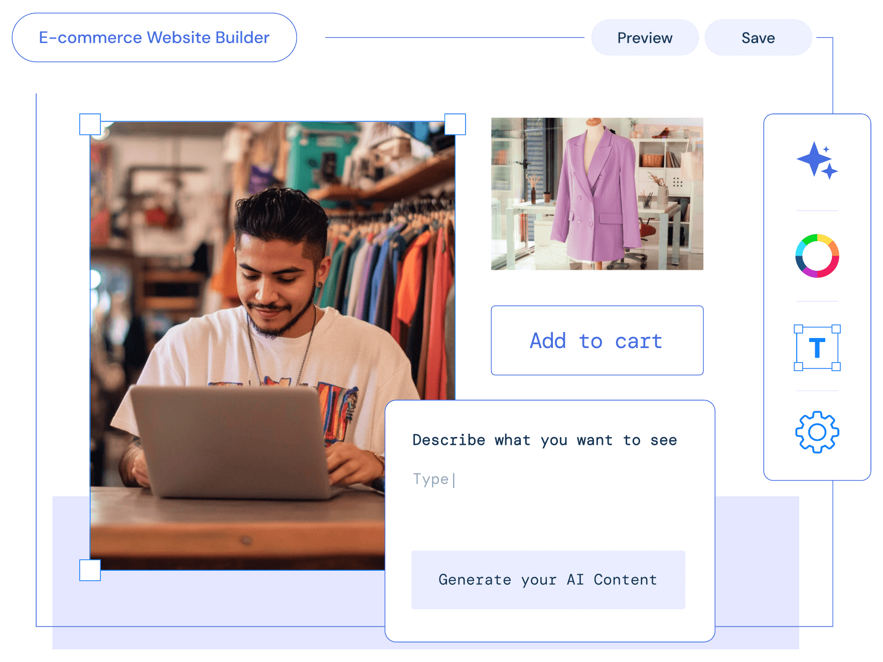 Just insert your business idea or niche, and our AI-powered best eCommerce website builder does the rest. With lightning speed, it generates a custom template with unique design and content ideas specific to your online store.
