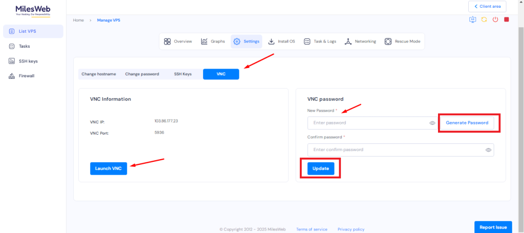 • To change the VNC password, click on Generate Password to create a new one or enter a custom password.