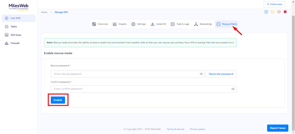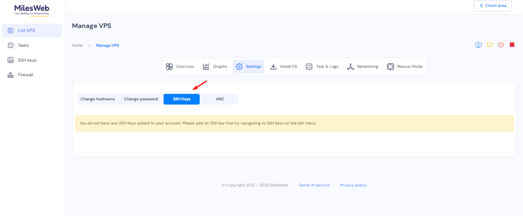 To access advanced VPS controls, log in to your MilesWeb client area using your registered email address and password.