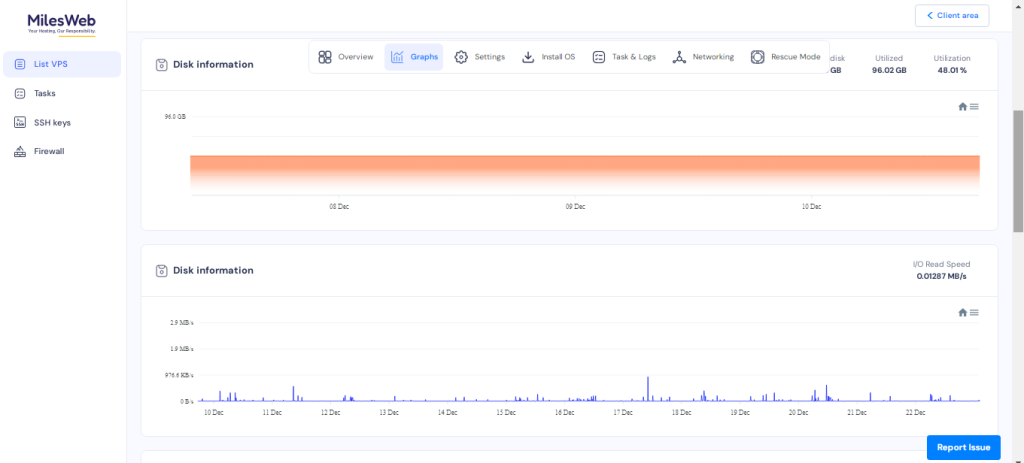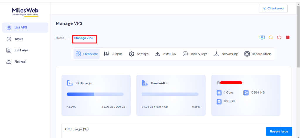 Under the Manage VPS section, navigate to Graphs to monitor server performance in detail. Here, you can: