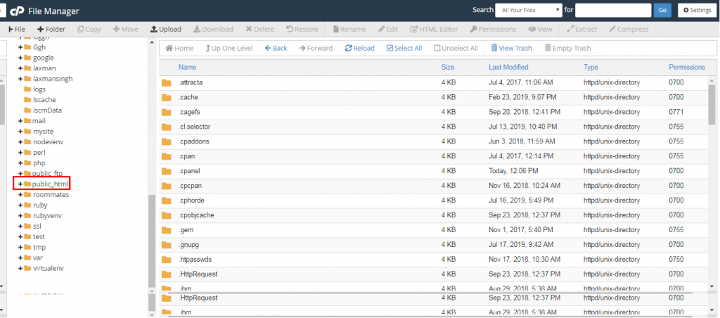 2. After logging in to the File Manager, you will be in the root directory for your account. For maximum time, you’ll be working with website files that are located in the “public_html” directory.