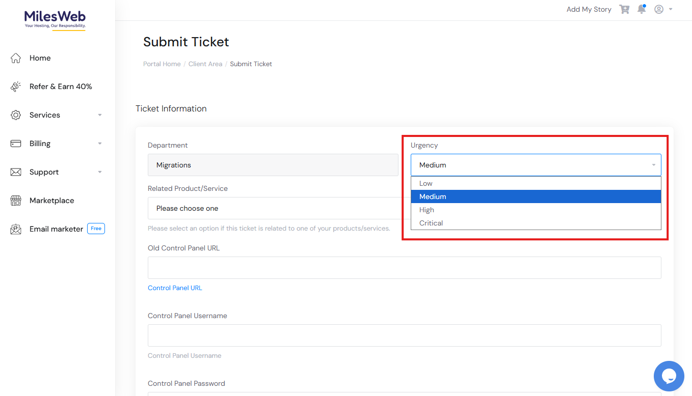 In this way, you can easily create and submit a ticket from the MilesWeb client area.