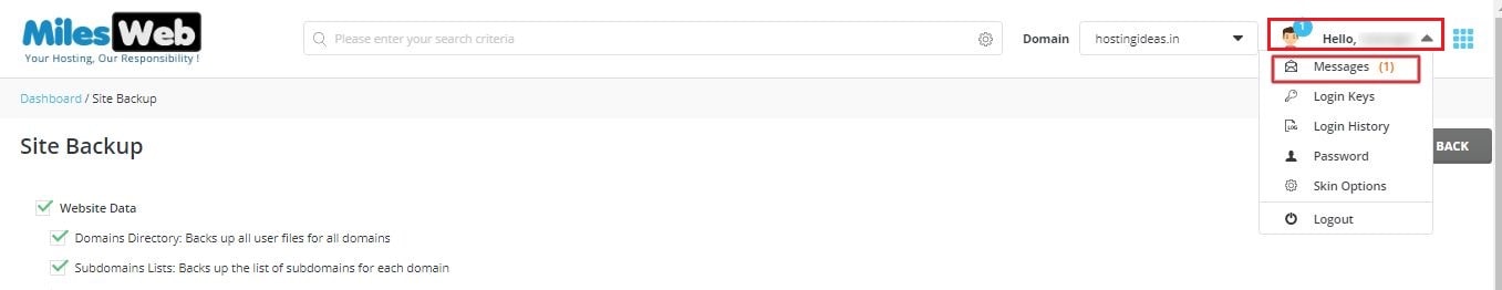 4. As soon as the backup is ready, the system will generate a message for your DirectAdmin account. You can access it by clicking on the user menu on the top-right corner of the dashboard and clicking the Messages option.