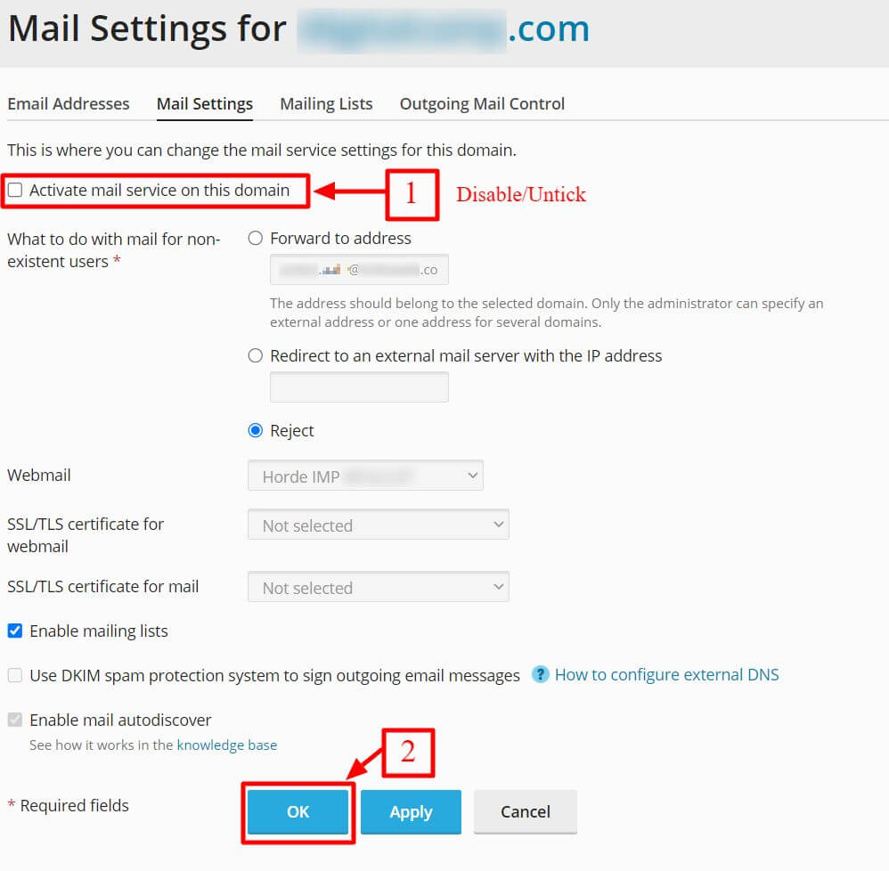 3. Untick/disable the Activate mail service on this domain option and scroll down to the end to click OK.