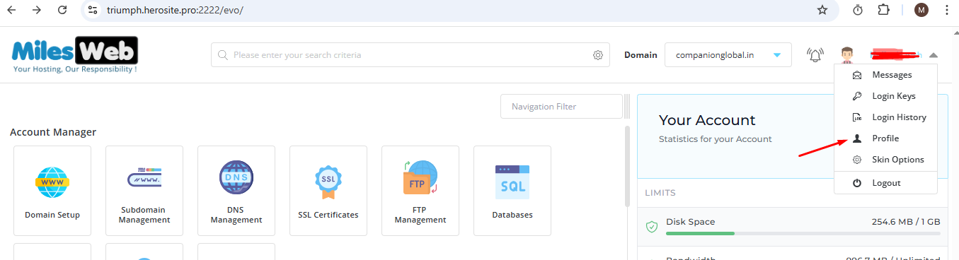 From the user menu located in the top right corner of the control panel, click Profile option.
