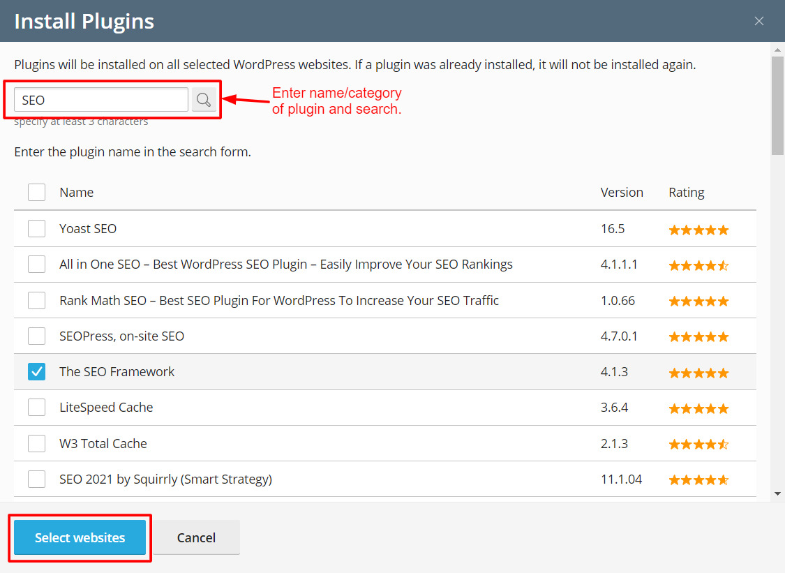 - Select the plugin you want to install and click the Select websites button.