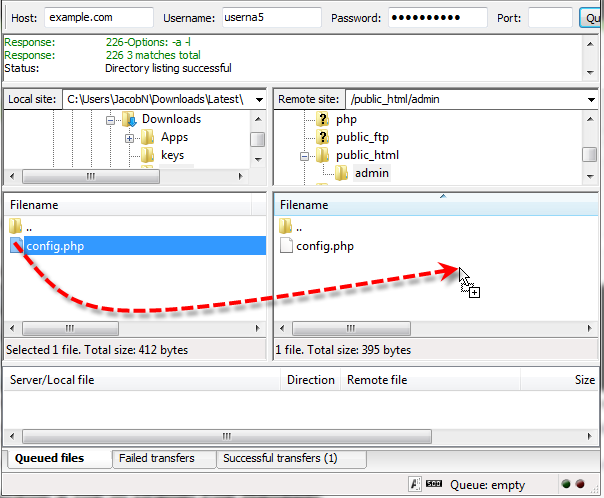 Step 3: If you wanted to restore the file you have backed up, simply reverse the process and drag the backed up file from your local folder on the left to the remote server directory on the right.