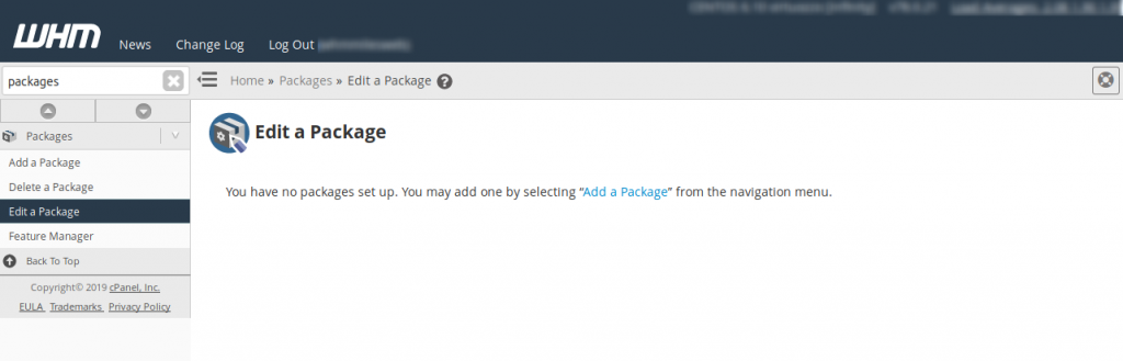 1. Open WHM in your browser and type “packages” in the search box, with this the menu options will be sorted for you. Find the option “Add a Package” and click on it.